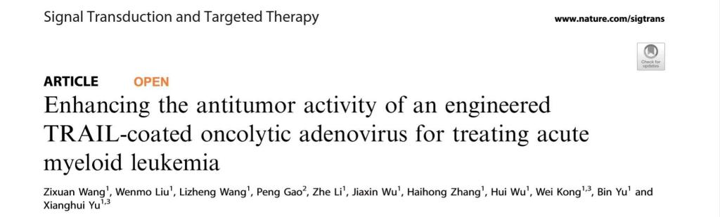 2020年4月24日,太阳成集团tyc234cc于湘晖教授课题组在国内主办的SCI杂志Signal Transduction and Targeted Therapy上发表文章,题为“ Enhancing the antitumor activity of an engineered TRAIL-coated oncolytic adenovirus for treating acute myeloid leukemia ”,该研究构建了一种表达TRAIL融合蛋白的溶瘤腺病毒,和人参皂苷Rh2联用,实现了选择性杀伤血液肿瘤,为白血病的治疗提供了新的思路。
