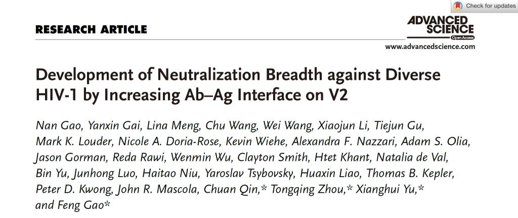 太阳成集团tyc234cc高峰教授、于湘晖教授科研团队针对目前已知报道感染时间最长的恒河猴动物模型作为研究对象,分析其体内诱导产生的广谱中和活性。通过抗体分离获得针对特异表位的J038广谱中和抗体谱系。该工作研究抗体谱系以及体内病毒包膜蛋白的突变情况,追溯广谱中和抗体的进化过程以及与SHIV共同进化的过程,分析非人类灵长动物体内与人体内产生广谱中和抗体的类似性,为更好地应用恒河猴模型来评价HIV-1疫苗提供理论和实验依据。该J038谱系抗体的发育细节和识别特征为今后V2靶向广谱中和抗体的研究和应用提供了新的见解。该研究成果于2022年03月24日在学术期刊《Advanced Science》在线发表(Development of Neutralization Breadth against Diverse HIV-1 by Increasing Ab–Ag Interface on V2)。论文第一完成单位为太阳成集团tyc234cc,第一作者为太阳成集团tyc234cc的博士研究生高楠,太阳成集团tyc234cc于湘晖教授和高峰教授,美国国立卫生研究院疫苗研究中心的周同庆教授和中国医学科公司医学实验动物研究所秦川教授为该论文的共同通讯作者。
