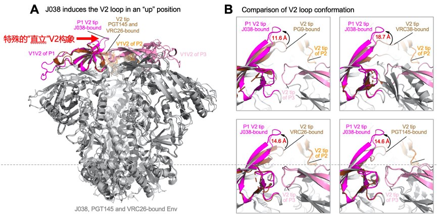 随着抗体分离技术的成熟以及对于抗体-抗原进化机制的深入了解,大量针对HIV-1的广谱中和抗体被分离并被进行深入研究。由于遗传背景的同源性,非人类灵长动物模型广泛应用于艾滋病研究领域。然而对类似于人源广谱中和抗体是否可以在非人类灵长动物中产生以及它们是否以与在人体内的抗体相似的方式进化成熟,人们知之甚少。对此高峰教授、于湘晖教授团队长期跟踪研究了感染携带HIV-1包膜蛋白基因的人/猴免疫缺陷嵌合病毒(SHIV)长达7年的中国源恒河猴,并在它们体内检测到与人源广谱中和抗体具有相似的表位的HIV-1广谱中和活性的产生。随后该团队在恒河猴G1015R体内分离到针对HIV-1包膜蛋白V2区的广谱中和抗体J038谱系(其中J038广谱度达到~54%),这也是目前报道的分离自SHIV感染的猴体内广谱度最高的抗体 (图1)。