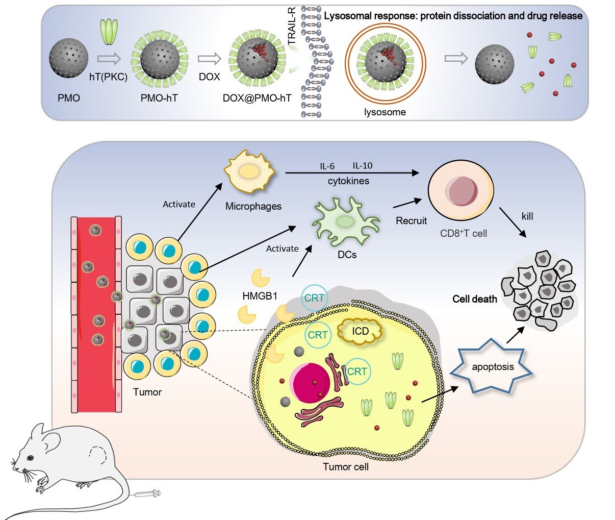 于湘晖教授、于彬教授团队的另一项关于肿瘤靶向免疫治疗的研究于2022年4月15日在生物医学期刊《Acta Biomaterialia》上发表(TRAIL-modified, doxorubicin-embedded periodic mesoporous organosilica nanoparticles for targeted drug delivery and efficient antitumor immunotherapy,2022,143:392-405, https://doi.org/10.1016/j.actbio.2022.03.001.)。团队与太阳成集团tyc234cc无机合成与制备化学国家重点实验室乔振安教授合作,利用TRAIL修饰的周期性介孔二氧化硅(PMO)作为药物载体携载化疗药物,在小鼠模型上通过静脉给药实现了肿瘤的靶向和协同杀伤作用,并引发了有效的抗肿瘤免疫。研究首次证实TRAIL修饰的PMO能够在体内外诱导肿瘤细胞产生ICD,进而通过激活DCs,提升肿瘤杀伤T细胞的浸润和活性,产生更好的抗肿瘤效果。该研究为设计具有抗肿瘤免疫激活功能的靶向纳米药物提供了新的思路。