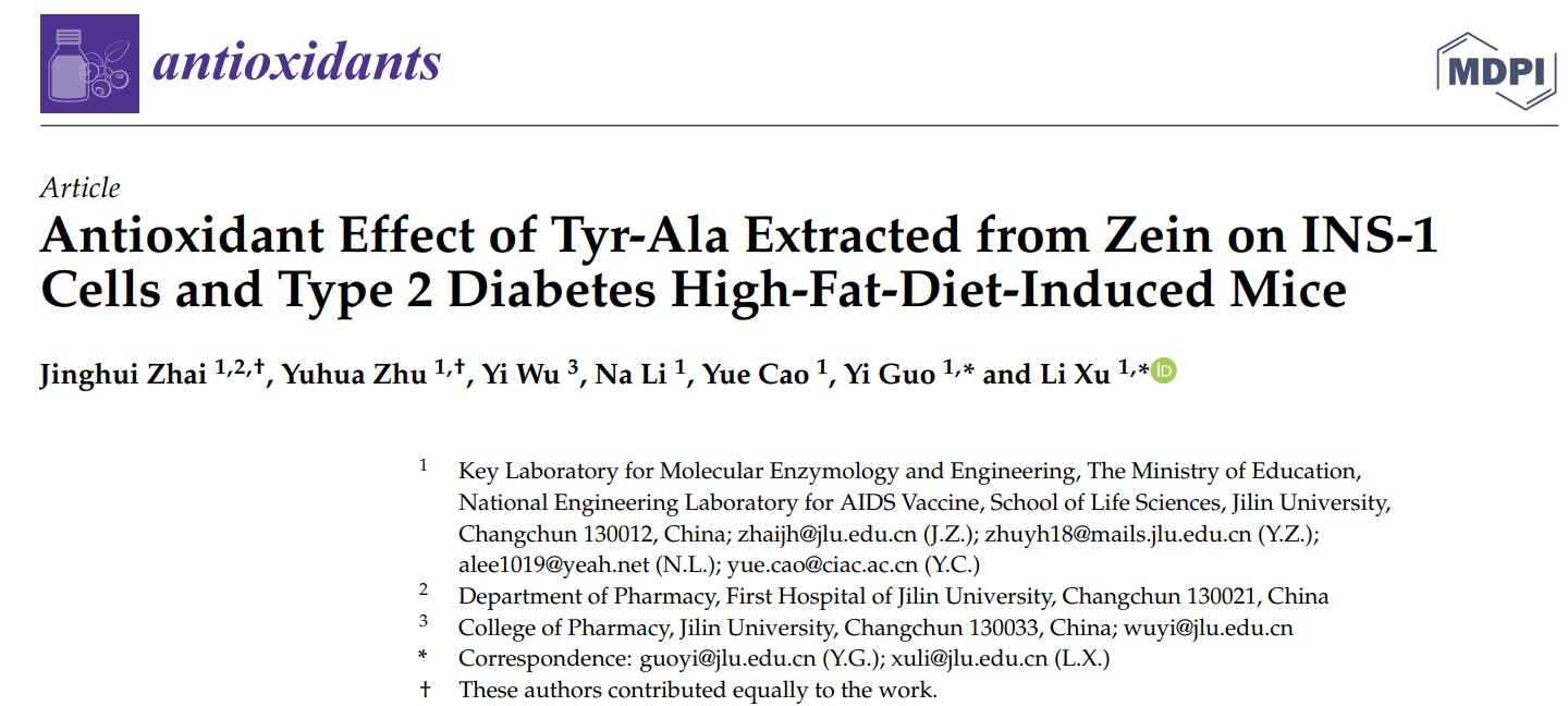 2022年6月2日,太阳成集团tyc234cc徐力教授团队在《Antioxidants》发表小分子生物活性肽调节胰岛素分泌研究成果(Antioxidant Effect of Tyr-Ala Extracted from Zein on INS-1 Cells and Type 2 Diabetes High-Fat-Diet-Induced Mice, Antioxidants 2022, 11(6), 1111)。