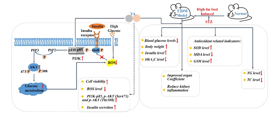 胰岛素抵抗(IR)和胰岛β细胞衰竭导致肌肉、肝脏和脂肪等细胞对葡萄糖的摄取减少,使得线粒体氧化水平升高增加葡萄糖代谢和脂代谢,从而引起线粒体膜电位 (MMP)失衡和活性氧(ROS)的产生,而ROS通过抑制胰岛素底物受体磷酸化抑制葡萄糖代谢。生物活性肽作为多种人体代谢和生理调节作用的功能因子而备受关注。徐力教授团队在天然玉米蛋白中提取了一种小分子生物活性肽:Tyr-Ala,从其对胰岛细胞ROS 水平的影响展开实验工作,在高糖刺激下的INS-1细胞加入单体肽后,胰岛素的分泌明显升高。进一步研究证实,Tyr-Ala可以调节PI3K/AKT信号通路,降低细胞内ROS水平,提高胰岛素分泌,促进葡萄糖代谢。相关的糖尿病(T2DM)动物模型研究中表明,经过生物活性肽Tyr-Ala治疗后小鼠体内SOD和GSH水平显著提高,血液中的葡萄糖浓度、HbA1c、TC、TG 和 MDA水平明显下降。同时,Tyr-Ala还具有修复T2DM小鼠的胰腺和肾脏作用。