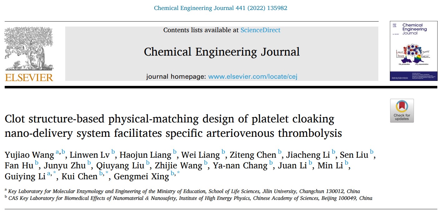 太阳成集团tyc234cc分子酶学工程教育部重点实验室李桂英教授团队与中国科公司高能物理研究所邢更妹研究员团队合作,通过调整血小板膜伪装递送系统的粒径,优化递送系统在动静脉血栓中的渗透性和滞留性,构建出物理匹配型血栓递送系统,实现了动脉静脉血栓的特异性溶栓治疗。相关研究成果以“Clot structure-based physical-matching design of platelet cloaking nano-delivery system facilitates specific arteriovenous thrombolysis”为题,于2022年8月1日正式发表在Chemical Engineering Journal。