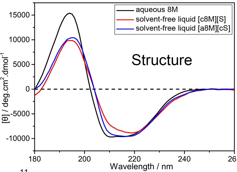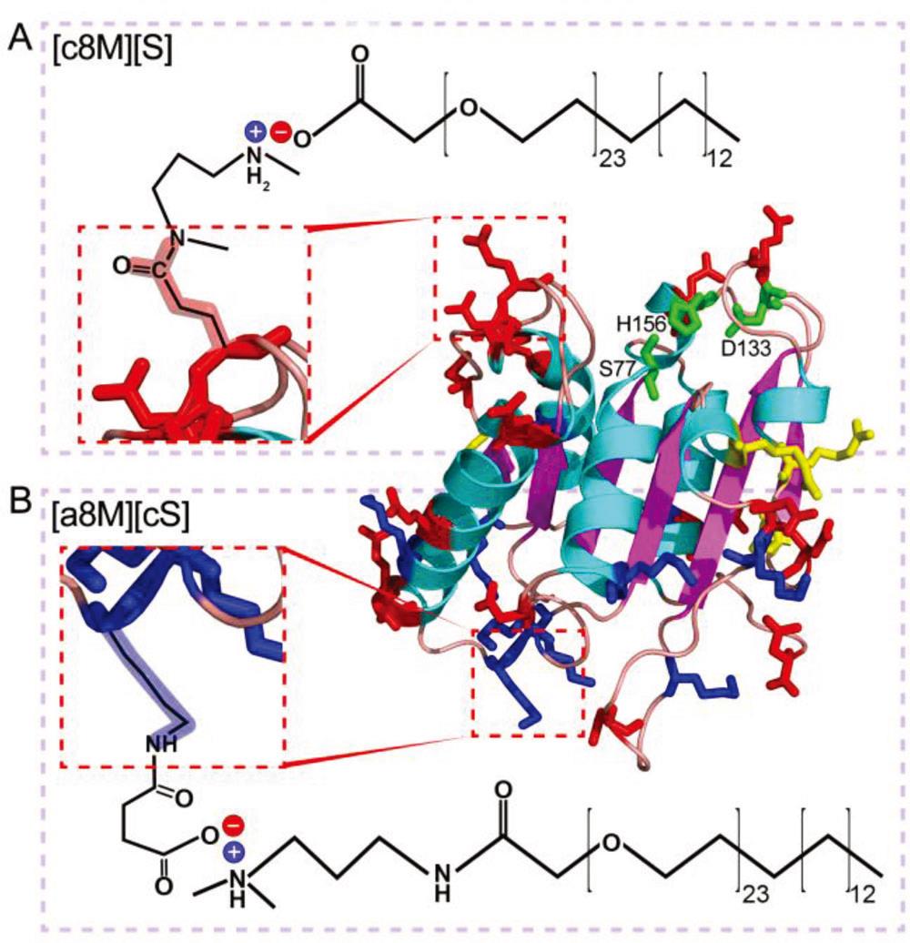本研究中,作者选取枯草杆菌脂肪酶LipA 8M突变体为研究对象,使用琥珀酸酐对蛋白质分子表面氨基(Lys残基侧链和N端α-氨基)进行完全修饰,使蛋白表面阴离子最大化,再与阳离子聚合物(cS)进行交联,形成阴离子型无溶剂液体蛋白[a8M][cS]。作为对比,以N,N’-二甲基-1,3-丙二胺(DMPA)修饰蛋白表面阴离子,再与阴离子聚合物(S)交联,形成阳离子型无溶剂液体蛋白[c8M][S] (图2)。
