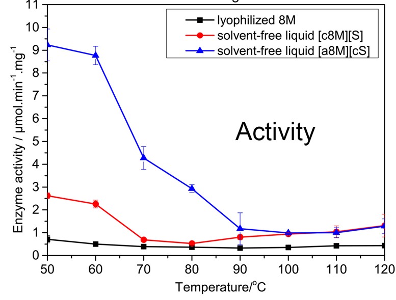 实验中使用SRCD、SAXS、DSC、ATR-FTIR、UV-vis等多种生物物理和化学表征手段对液体蛋白合成的各个阶段进行了表征与鉴定。结果表明,在脂肪酶制备液体蛋白的研究中,通过阴离子修饰合成的液体脂肪酶[a8M][cS]无论在结构完整性和活力上都高于阳离子型液体脂肪酶[c8M][S]。本研究中同时以肌红蛋白(Mb)作为对照蛋白进行了相应的液体蛋白的合成。在肌红蛋白的液体蛋白合成研究中,阴离子修饰导致了Mb的完全变性去折叠,同时蛋白的旋光性也发生了改变,但是与cS聚合物的交联后蛋白实现再折叠。阴离子型液体蛋白[aMb][cS]的α-螺旋水平高于[cMb][S],稳定性更强。此外,阴离子液体酶的活性也远高于阳离子液体酶,并且在120℃下依然保持了10%以上的活性(图3),实现了常温酶向超嗜热酶的转变。阴离子型无溶剂液体蛋白优点更明显,适用性更强,为研究者在高温下催化反应提供了更多的选择。