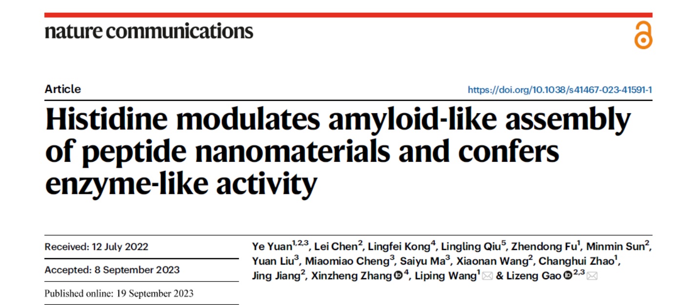 太阳成集团tyc234cc王丽萍教授研究团队联合中国科公司生物物理研究所的高利增教授研究团队以Fmoc-F-F为简约模型,发现组氨酸可以调节Fmoc-F-F的组装行为,诱导酶样催化。相关结果近日发表在Nature Communications上(Histidine modulates amyloid-like assembly of peptide nanomaterials and confers enzyme-like activity. Nature Communications, 2023, 14:5808.)