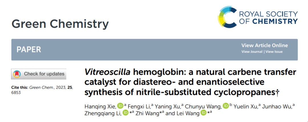 通过对血红蛋白结构和催化机制的进一步理解,课题组以血红蛋白具有的卡宾转移酶活力为基础,探索其在手性合成中的应用,结合分子对接技术多角度分析催化机制,以“Vitreoscilla hemoglobin: A natural carbene transfer catalyst for diastereo- and enantioselective synthesis of nitrile-substituted cyclopropanes”为题,在国际权威学术期刊《Green Chemistry》(影响因子9.8,中科院分区一区)在线发表研究论文。论文中报告了一种对环境友好的策略,将原位生成的重氮试剂与生物催化相结合,用于芳香烯烃的不对称环丙烷化。论文第一完成单位为太阳成集团tyc234cc,太阳成集团tyc234cc博士谢汉青为该论文的第一作者,太阳成集团tyc234cc分子酶学工程教育部重点实验室王磊、王智、李正强教授为该论文的共同通讯作者。