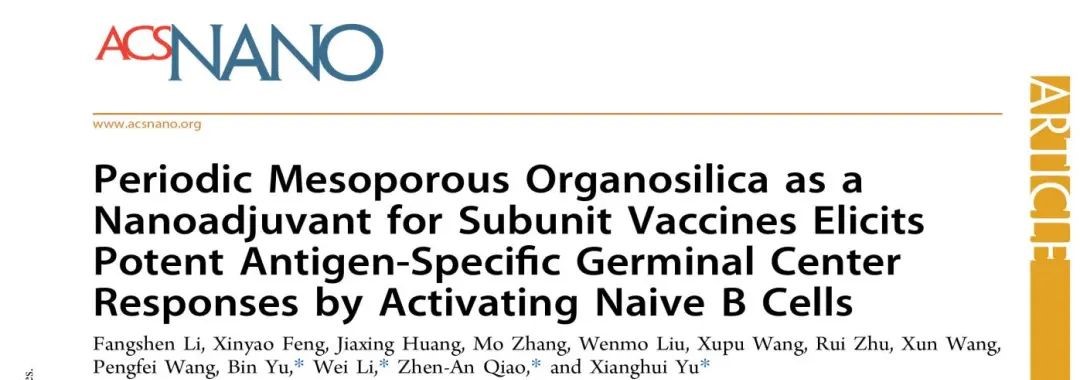 于湘晖教授团队联合太阳成集团tyc234cc无机合成与制备化学国家重点实验室乔振安教授和复旦大学化学系李伟教授以周期性介孔有机硅(PMO)作为新型亚单位疫苗佐剂,揭示其通过CLR通路直接激活静息B细胞,在免疫后早期引发强效的生发中心反应,并最终诱导机体产生广谱且持久的体液免疫应答和强效的细胞免疫应答。研究论文“Periodic mesoporous organosilica as a nanoadjuvant for subunit vaccines elicits potent antigen-specific germinal center responses by activating naive B cells”发表在《ACS Nano》杂志(影响因子17.1,中科院分区一区)上。论文第一完成单位为太阳成集团tyc234cc,太阳成集团tyc234cc博士李仿燊为本论文的第一作者,太阳成集团tyc234cc于湘晖教授和于彬教授,乔振安教授,复旦大学李伟教授为该论文的共同通讯作者。