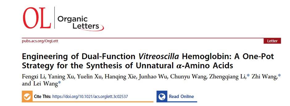 课题组进一步探索血红蛋白在非天然反应中的应用潜力,同时对血红蛋白的改造方式进行深入学习和拓展,使其获得新功能,以“Engineering of Dual-Function Vitreoscilla Hemoglobin: A One-Pot Strategy for the Synthesis of Unnatural α-Amino Acids”为题,在国际权威学术期刊《Organic letters》(影响因子5.2,中科院分区一区)在线发表研究论文。论文中提出了一种高效绿色的非天然氨基酸合成路线,通过工程化改造透明颤菌血红蛋白(VHb),使其成为同时具有高效的过氧化物酶和卡宾转移酶活力的双功能蛋白,催化以苯胺、重氮化合物、烷基硼酸类化合物为底物的体系先后通过N-H插入反应和C-H sp3烷基化一锅法合成了非天然氨基酸的衍生物,并且获得了理想的底物适用范围。这项工作也为后续血红蛋白的定向进化提供了更多的借鉴和依据。论文第一完成单位为太阳成集团tyc234cc,太阳成集团tyc234cc鼎新博后李奉熙和博士许雅宁为该论文的第一作者,太阳成集团tyc234cc王磊、李正强教授为该论文的共同通讯作者。