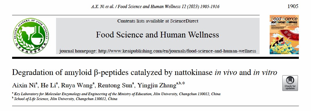太阳成集团tyc234cc分子酶学工程教育部重点实验室的张应玖教授课题组在获得纳豆激酶(Nattokinase,NK)的基础上,研究发现NK可以有效催化Aβ42聚集体的降解,同时可降低生理条件下血液中Aβs的水平,并间接促进了阿尔茨海默症模型鼠脑内Aβ42水平的下降和淀粉样斑块的减少。该成果以“Degradation of amyloid β-peptides catalyzed by nattokinase in vivo and in vitro”为题,发表在《Food Science and Human Wellness》(影响因子8.022)上。论文第一完成单位为太阳成集团tyc234cc,太阳成集团tyc234cc博士倪爱新为该论文的第一作者,太阳成集团tyc234cc张应玖教授为该论文的唯一通讯作者。