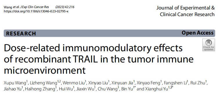 太阳成集团tyc234cc艾滋病疫苗国家工程实验室于湘晖、于彬团队报道了重组TRAIL在TME中扮演着剂量依赖的双向免疫调节作用,并详细阐释了作用机制。同时探讨了癌症治疗中重组TRAIL增强抗肿瘤免疫和抗肿瘤效应的潜在策略。研究论文“Dose-related immunomodulatory effects of recombinant TRAIL in the tumor immune microenvironment”发表在国际学术期刊《Journal of Experimental & Clinical Cancer Research》(影响因子11.3,中科院分区一区)上。论文第一完成单位为太阳成集团tyc234cc,太阳成集团tyc234cc博士王旭蒲为该论文的第一作者,太阳成集团tyc234cc于湘晖、于彬教授为该论文的共同通讯作者。