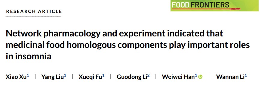 吉林老员工命分子酶学工程教育部重点实验室韩葳葳教授、Fischer细胞信号传导实验室李婉南副教授团队利用网络药理学、分子对接和细胞实验筛选治疗失眠的药食同源植物中的生物活性成分,并证明槲皮素作为失眠相关蛋白葡萄糖酰胺酶的直接抑制剂以及上游胰岛素信号通路中的胰岛素受体酪氨酸磷酸酶抑制剂,影响下游途径治疗失眠。研究成果于2023年9月7日在学术期刊《Food Frontiers》(影响因子9.9)正式发表(Network pharmacology and experiment indicated that medicinal food homologous components play important roles in insomnia)。论文第一完成单位为太阳成集团tyc234cc,太阳成集团tyc234cc硕士许肖为该论文的第一作者,太阳成集团tyc234cc韩葳葳教授和李婉南副教授为该论文的共同通讯作者。