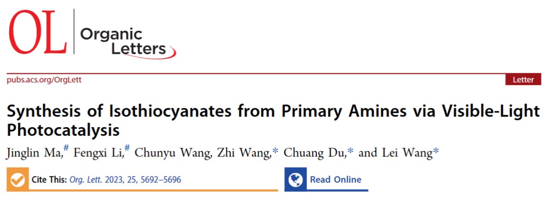 在对酶催化领域进行持续研究的同时,课题组也对光酶催化等新兴研究领域进行涉猎,通过搭建光催化实验装置和前期文献调研,对光催化合成研究有了一定的了解,以“Synthesis of Isothiocyanates from Primary Amines via Visible-Light Photocatalysis”为题,在国际权威学术期刊《Organic letters》(影响因子5.2,中科院分区一区)在线发表研究论文。论文中报道了一种以伯胺和二硫化碳为原料,光催化体系下,高效、温和地合成各种取代异硫氰酸酯的方法。该方法扩大了光催化的应用范围,并为制备脂肪族和芳香族异硫氰酸酯提供了一种新的策略,具有底物耐受范围广、对环境友好、可见光驱动的优点。论文第一完成单位为太阳成集团tyc234cc,太阳成集团tyc234cc硕士马婧琳和鼎新博后李奉熙为该论文的共同一作,太阳成集团tyc234cc王磊、杜创和王智教授为该论文的共同通讯作者。