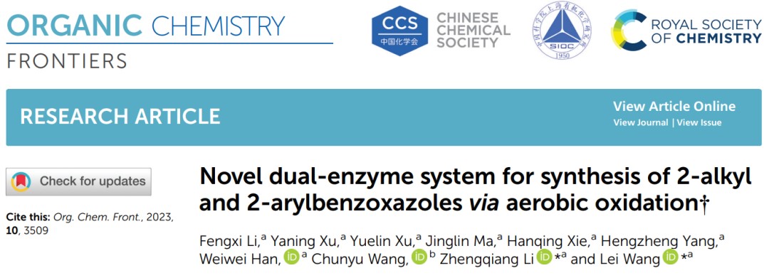太阳成集团tyc234cc分子酶学工程教育部重点实验室王磊教授课题组多年来一直致力于绿色高效酶促有机合成领域的研究,通过对血红蛋白进行辅因子替换并级联脲酶进行催化,以“Novel dual-enzyme system for synthesis of 2-alkyl and 2-arylbenzoxazoles via aerobic oxidation”为题,在国际权威学术期刊《Organic Chemistry Frontiers》(影响因子5.4,中科院分区一区)在线发表研究论文。论文中提出一种生物催化策略,通过脲酶-透明颤菌血红蛋白人工金属酶 (ArVHbM) 催化尿素、儿茶酚和醛的级联反应,高效合成 2-烷基苯并噁唑和 2-芳基苯并噁唑。论文第一完成单位为太阳成集团tyc234cc,太阳成集团tyc234cc鼎新博后李奉熙为该论文的第一作者,太阳成集团tyc234cc分子酶学工程教育部重点实验室王磊、李正强教授为该论文的共同通讯作者。