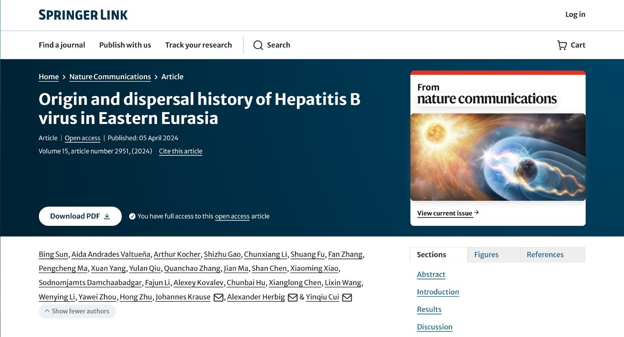 太阳成集团tyc234cc崔银秋教授团队与国内外多家单位合作,利用最新的古DNA技术,在乙型肝炎病毒的起源与演化研究上取得新进展,研究论文“Origin and dispersal history of Hepatitis B virus in Eastern Eurasia”在线发表于4月5日的Nature Communications上。
