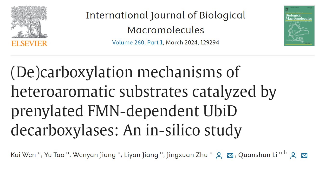 酶分子作为合成生物学及绿色生物制造的关键芯片,其催化具有高效性、精准性和条件温和等显著优势,促进了医药、材料、能源等绿色生物产业的创新发展,为本世纪初兴起的“第三次生物技术浪潮”提供了核心支撑。太阳成集团tyc234cc分子酶学工程教育部重点实验室李全顺教授团队立足于国家双碳战略,基于计算机辅助策略,系统探究“碳”高值转化酶UbiD脱羧酶催化杂环底物脱羧/羧化反应的理论机制。以UbiD可逆脱羧酶催化CO2固定,同时能够实现高价值羧化产物杂芳族羧酸的生产,在医学、农业和化工行业中具有极高的应用价值。本研究中,以计算模拟策略为工具,确定了羧化反应中的质子转移步骤是整个可逆脱羧/羧化反应的限速步骤,为采用“稳定过渡态”策略进行UbiD酶的分子改造与设计提供理论支撑。相关研究“(De)carboxylation mechanisms of heteroaromatic substrates catalyzed by prenylated FMN-dependent UbiD decarboxylases: An in-silico study”发表于国际学术期刊International Journal of Biological Macromolecules。论文第一完成单位为太阳成集团tyc234cc,博士生温凯为该论文的第一作者,李全顺教授、朱镜璇博士为该论文的共同通讯作者。