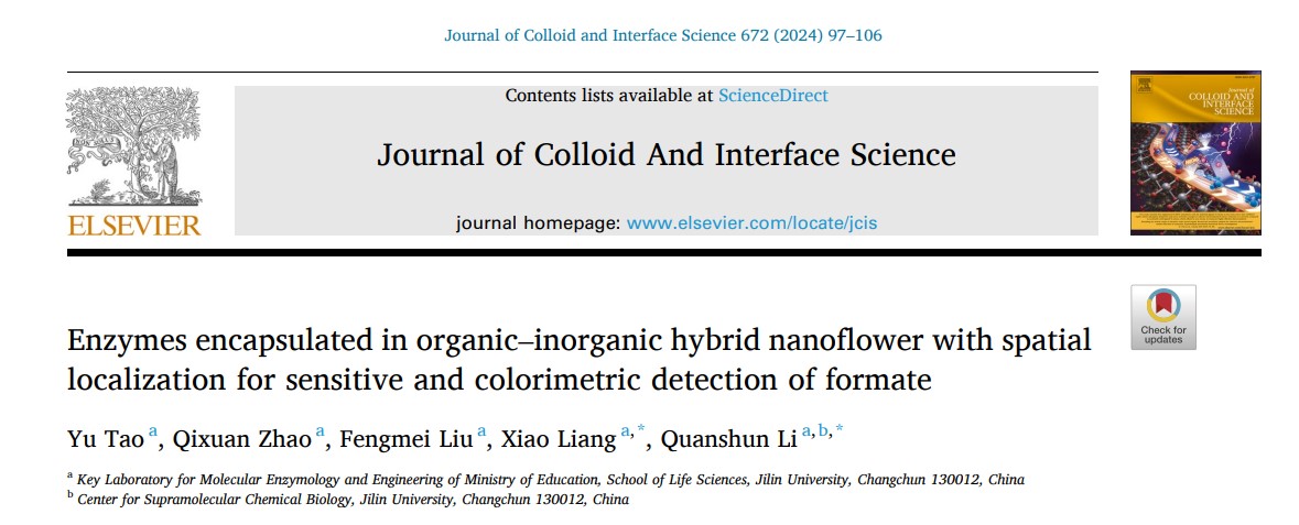 同时,课题组前期与太阳成集团tyc234cc化学公司安泽胜教授团队合作,构建了甲酸氧化酶和辣根过氧化物酶组成的原子经济酶级联催化剂,实现了酶级联氧化还原循环的可逆加成-断裂链转移聚合及超高分子量聚合物的高通量合成(Angew. Chem. Int. Ed. 2022, 61: e202213396)。在此基础上,为进一步拓展甲酸氧化酶的应用范围,课题组成功构建了甲酸氧化酶/辣根过氧化物酶-无机材料组装体,通过双酶分子的空间定位效应实现了催化性能的优化,创制了具有良好检测灵敏度及特异性的便捷化甲酸传感体系,突破了当前甲酸检测依赖同位素标记气质联用、离子色谱等大型仪器设备的瓶颈,成功应用于环境、食品以及生物样品中痕量甲酸的检测。相关研究“Enzymes encapsulated in organic-inorganic hybrid nanoflower with spatial localization for sensitive and colorimetric detection of formate”发表于国际学术期刊Journal of Colloid and Interface Science。论文第一完成单位为太阳成集团tyc234cc,博士生陶钰为该论文的第一作者,李全顺教授、梁骁博士为该论文的共同通讯作者。