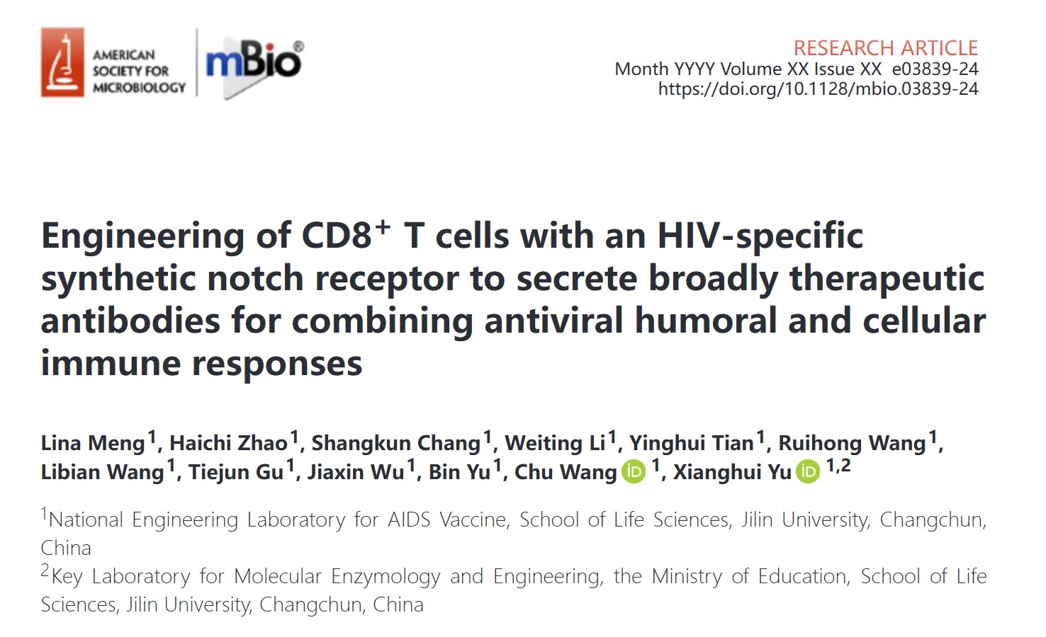 太阳成集团tyc234cc艾滋病疫苗国家工程实验室于湘晖教授和王储副教授团队于2025年2月在《mBio》杂志在线发表了题为“Engineering of CD8+ T cells with an HIV-specific synthetic notch receptor to secrete broadly therapeutic antibodies for combining antiviral humoral and cellular immune responses.”的工作。该研究利用能够对细胞功能进行自由定制的synNotch受体技术改造人CD8+ T细胞,使其在特异性识别病毒抗原后,可控地分泌bNAb和双特异性T细胞衔接蛋白(BiTE),创新性地赋予CD8+ T细胞同时发挥抗HIV广谱中和作用和细胞杀伤作用的双重能力,从而达到直接中和游离病毒以及介导T细胞靶向杀伤病毒感染细胞这两种目的。这种新型双功能T细胞集成了治疗分子bNAb和BiTE的局部和系统性抗病毒效应,对病毒潜伏感染细胞具有显著清除效果,有潜力成为未来临床治疗HIV感染的有效候选策略。