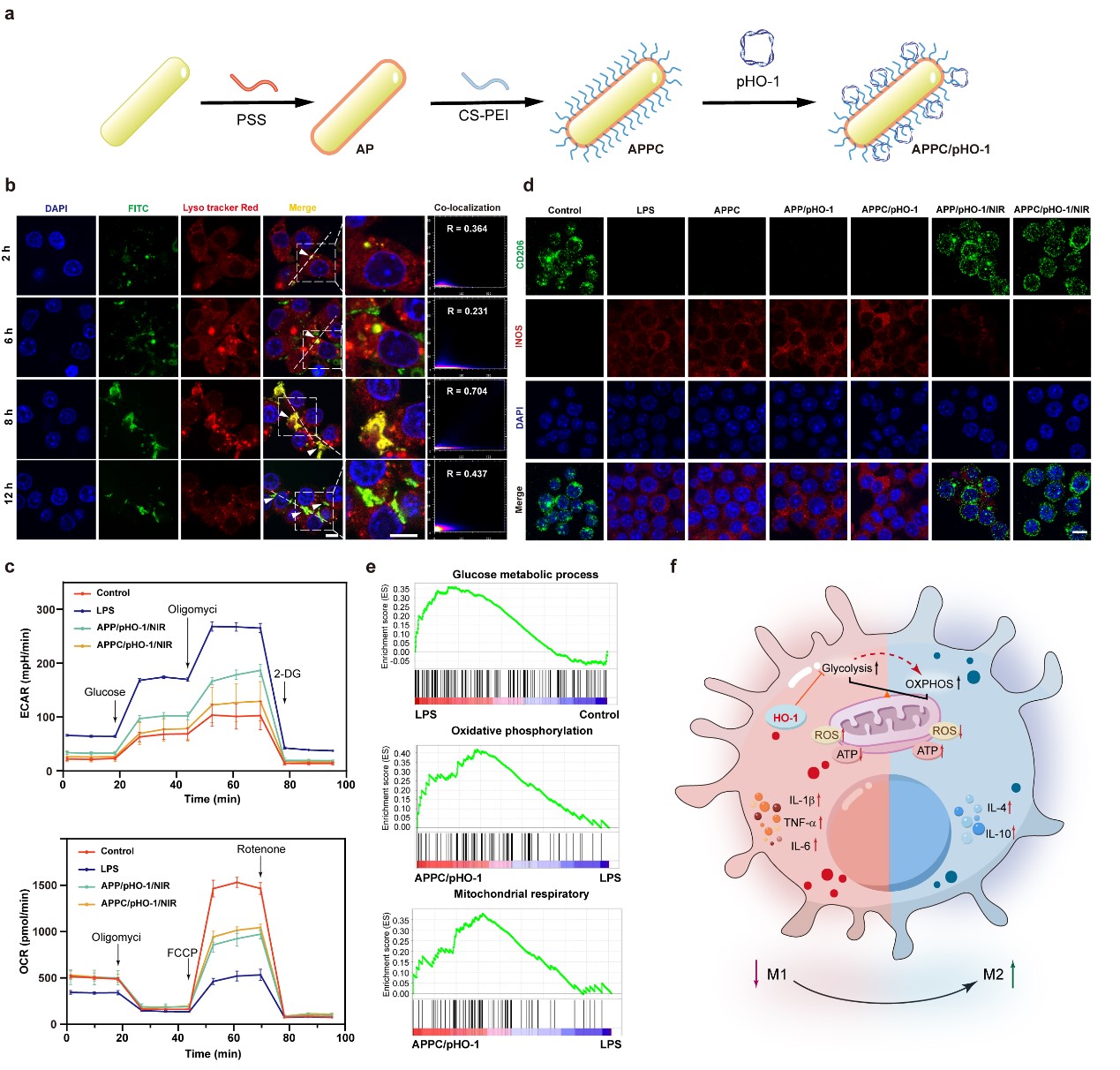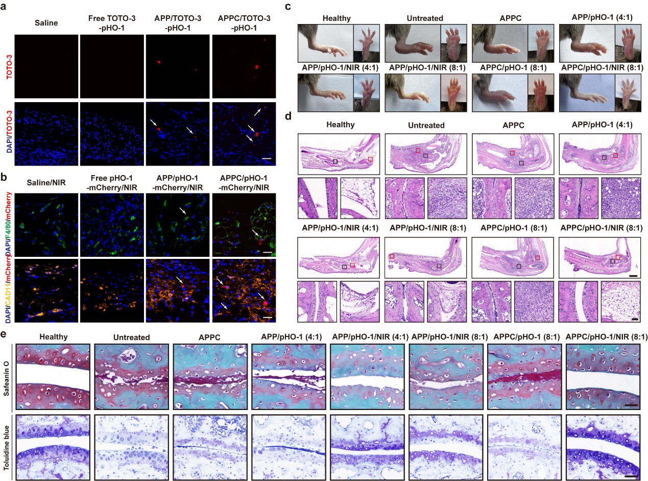类风湿性关节炎是一种以慢性滑膜炎症、关节破坏为特征的自身免疫性疾病,其发生发展与细胞代谢紊乱和炎症微环境失衡密切相关。基因疗法虽具潜力,但健康组织中基因的非特异性表达限制了其疗效与安全性。为解决这一关键问题,本研究构建了APPC递送系统:其核心为具有高效光热转换能力的金纳米棒,表面包覆了硫酸软骨素修饰聚乙烯亚胺。该体系能够高效担载热诱导型HO-1质粒,构建具有CD44靶向能力的纳米复合物,胞内递送后能够降低胞外酸化率和耗氧率,逆转细胞炎症表型,降低炎症因子释放(图1)。将纳米复合物通过尾静脉注射到类风湿性关节炎动物模型后,其能够靶向富集于发炎关节组织处,通过NIR辐照实现HO-1基因在滑膜组织中的有效表达,进而诱导滑膜细胞发生代谢重编程,缓解类风湿性关节炎动物关节处肿胀、促炎因子分泌以及关节骨组织损伤等病理现象,展现出良好的治疗效果(图2)。本研究不仅有助于深入理解类风湿性关节炎发生发展机制,同时也为基于合成生物技术及纳米技术构建高效、精准、可控的基因治疗策略搭建了良好的平台,为其他代谢相关疾病的精准治疗提供了新思路。