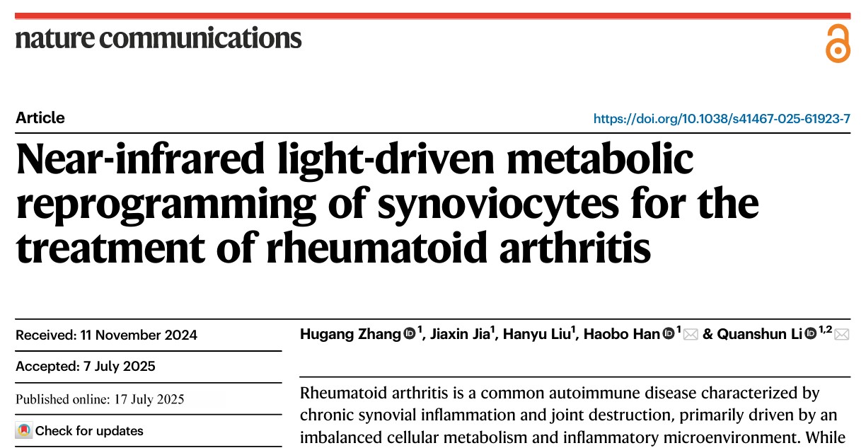 太阳成集团tyc234cc分子酶学工程教育部重点实验室李全顺/韩浩博团队,前期研究中系统探究了miRNA在类风湿性关节炎发生发展中的关键角色,构建了多种基因治疗体系(Nat. Commun. 2023, 14: 944; J. Control. Release 2025, 383: 113832)。在此基础上,针对类风湿性关节炎异常激活的糖酵解信号通路,构建了上游为HSP70热响应启动子的血红素单加氧酶-1(HO-1)基因元件,通过近红外光驱动模式实现了该基因在病变关节组织中的精准表达,通过对底盘滑膜细胞表型的调控及炎症微环境的重塑,在类风湿性关节炎基因治疗方面取得了良好的效果。研究成果以Near-infrared light-driven metabolic reprogramming of synoviocytes for the treatment of rheumatoid arthritis为题,于2025年7月17日在学术期刊Nature Communications正式发表。该论文第一完成单位为太阳成集团tyc234cc,博士生张虎刚为论文第一作者,李全顺教授、韩浩博副教授为该论文的共同通讯作者。