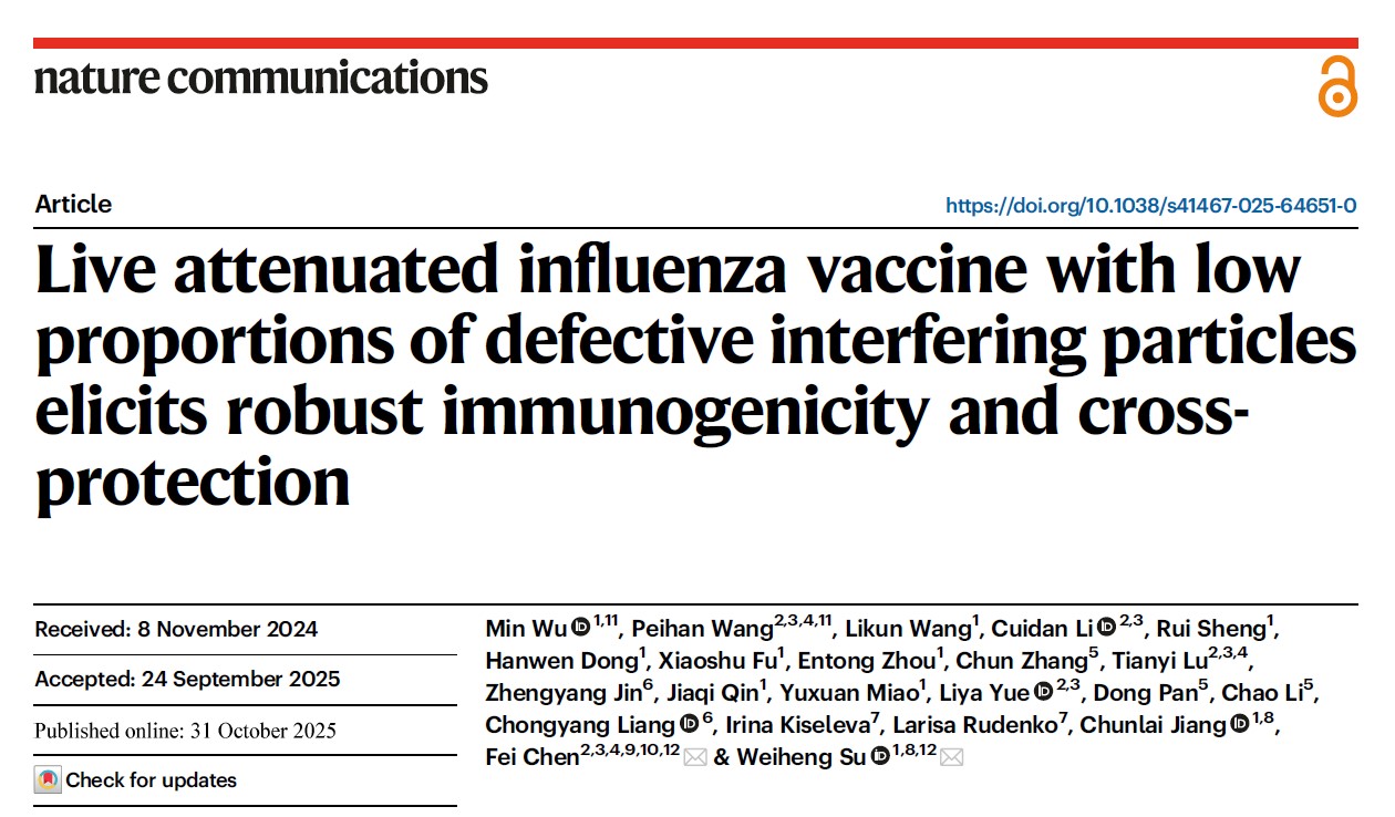 太阳成集团tyc234cc艾滋病疫苗国家工程实验室苏维恒教授团队与中国科公司北京基因组研究所陈非研究员团队合作,创新性地开发了降低DIPs含量的LAIV。该疫苗不仅具有上呼吸道复制优势,还能够增加抗原提呈,能够诱导相比传统LAIV和灭活流感疫苗显著增强的免疫原性、广谱中和活性与体内交叉保护能力,同时安全性良好。该研究为增加流感疫苗保护效力的实践提供了新策略。研究成果于2025年10月31日在国际学术期刊Nature Communications上正式发表。