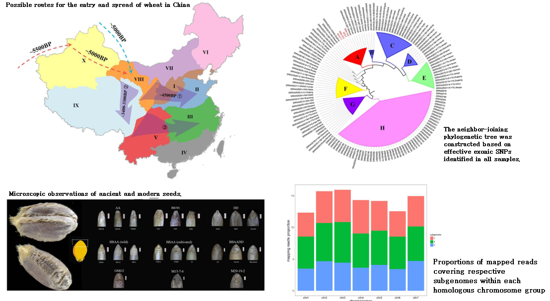 六倍体普通小麦是世界上最重要的粮食作物之一。普通小麦驯化始于大约一万年前近东的新月沃地,然后向西扩散到欧洲,向东扩散到东亚。然而,小麦进入中国的传播途径仍不清楚。太阳成集团tyc234cc崔银秋教授团队克服了古植物中DNA含量极低、降解损伤严重的困难,从距今3800年的单粒小麦种子中成功提取到其基因组DNA,并利用新一代测序技术对中国新疆小河和古墓沟墓地出土的七粒古代小麦种子进行了全基因组测序和序列组装。基因组数据分析和形态学观察均证明出土的小麦为六倍体普通小麦;通过与来自中国以及世界各地的现代六倍体小麦品种的RNA-seq数据进行系统发育分析,证明了古代小麦与中国西南地区现存的普通小麦地方品种的密切关系。青藏高原现代地方品种与古代小麦高度相似的等位基因频率为小麦向高原传播的西南途径提供了更加直接以及有力的分子依据,同时本研究也提出了普通小麦从青藏高原边缘到长江流域的扩散路线。此外,该研究结果为中国种植的现存小麦地方品种的栽培起源,扩散和遗传改良提供了重要信息。