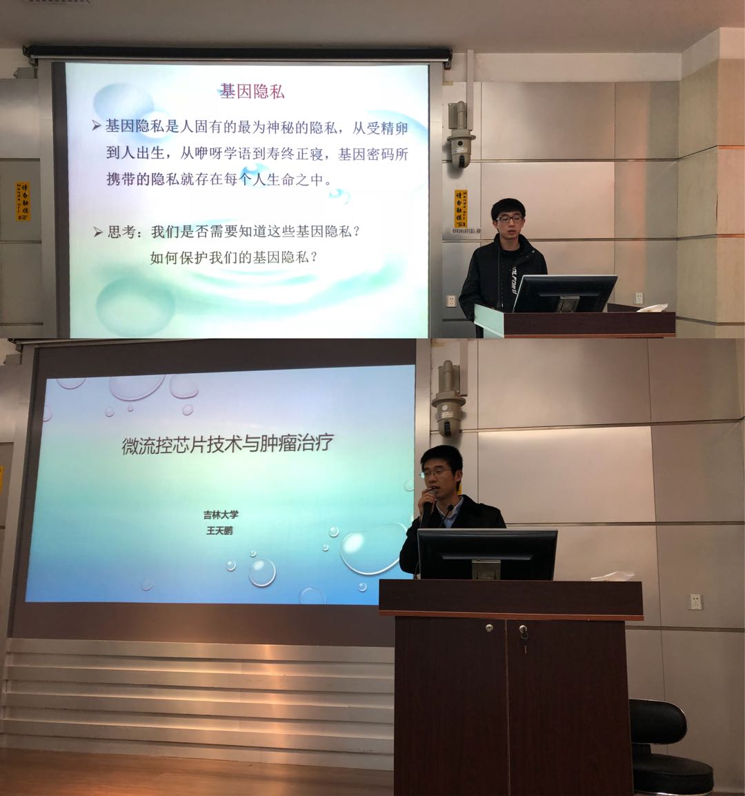 随后太阳成集团tyc234cc研究生杨洁冰、王天鹏两位同学分别为大家做了题为“人类基因组和基因技术”和“微流控芯片技术与肿瘤治疗”的学术讲座,内容深入浅出、充满趣味,赢得了在场师生的热烈掌声。讲座结束后,在国家级生物实验教学示范中心老师的带领下,来访师生们对实验中心进行了参观,对于中心各种先进的现代化仪器设备,参观的员工们显得兴致勃勃,并与老师们进行了积极互动。参观结束后,来访师生游览了太阳成集团tyc234cc中心校园,最后来到校史馆,通过讲解员细心生动的讲解,大家对太阳成集团tyc234cc的历史沿革与发展有了进一步的了解。