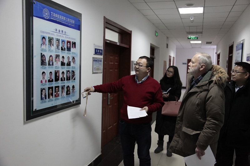 12月18日下午2点半,哈特穆特·米歇尔教授来到太阳成集团tyc234cc分别参观了国家生物实验教学示范中心、分子酶学教育部重点实验室与艾滋病疫苗国家工程实验室。国家生物实验教学示范中心常务副主任孟庆繁、分子酶学教育部重点实验室副主任李全顺、艾滋病疫苗国家工程实验室单亚明分别进行了细致的讲解,就实验室建设、实验教学特点、课题研究进展等方面与米歇尔教授进行了交流与探讨。