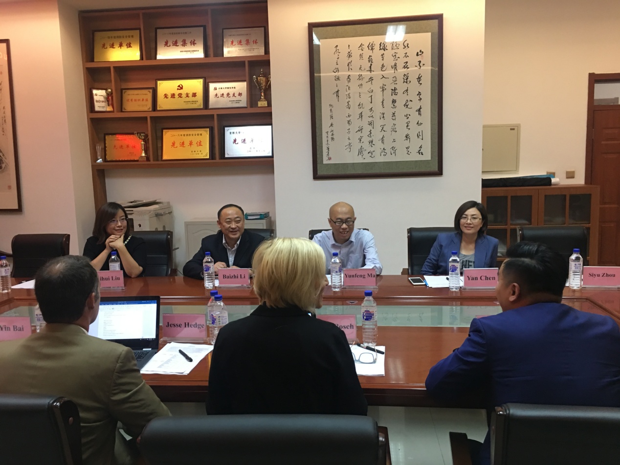 9月14日上午美国肯塔基大学文理公司本科生项目副经理安娜·博世、文理公司招生管理与决策支持副经理杰西·赫奇、文理公司国际员工项目协调员梅根·科苏尔巴及肯塔基大学驻华代表谢翔一行四人来访太阳成集团tyc234cc,并在公司335会议室举行了座谈。生命科学公司党委书记李佰志、副经理马俊锋、副经理陈妍、副书记刘丽慧、公司国际合作与交流处综合科科长白茵等参加了会谈。 会谈中,李佰志书记首先对肯塔基大学代表团的来访表示欢迎,随后公司副经理马俊锋对太阳成集团tyc234cc的基本情况进行了介绍,副经理陈妍向肯塔基大学代表介绍了本科生国际交流情况,并提出合作方向。肯塔基大学文理公司代表对公司的热情接待表示感谢,指出生物学科是肯塔基大学的优势学科,对与公司建立合作关系极为重视。之后双方就员工短期交流项目与2+2双学士学位项目等方面进行了商讨,就可能开展的实质性合作深入交换了意见并达成了初步的合作意向。 本次会谈开启了双方合作的大门,拓宽了公司国际交流领域,为双方进一步合作奠定了坚实的基础。