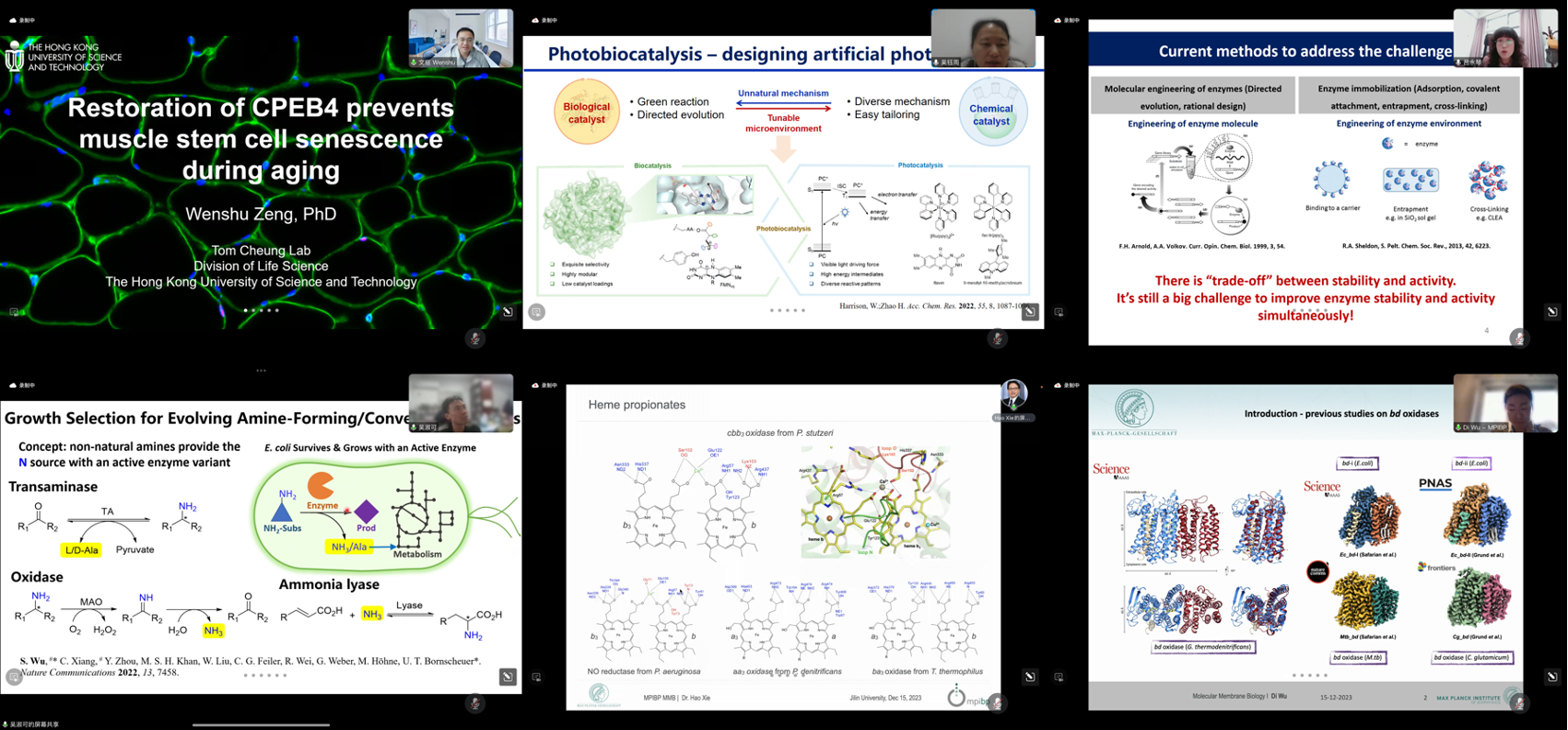 本次论坛围绕“酶分子设计、组装与催化机制”主题,来自美国印第安纳大学-普渡大学印第安纳波利斯分校Juexin Wang教授、斯坦福大学Wenshu Zeng博士、德国马克斯普朗克学会生物物理研究所Di Wu博士、Hao Xie博士、新加坡国立大学/亿杉医疗CEOShawn Li博士、中科院天津工业生物技术研究所袁波副研究员、南京工业大学吴斌教授、华中科技大学吴钰周教授、北京化工大学吕永琴教授、华中农业大学吴淑可教授与太阳成集团tyc234cc吴慧教授、李全顺教授,进行了精彩的学术报告,并与在线师生展开了深入探讨。
