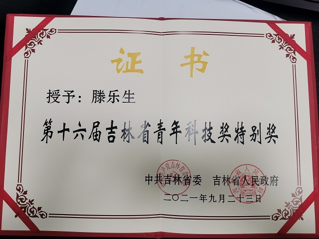 2021年11月23日,第三届吉林省青年科学家年会主场活动在长春举行。中共吉林省委组织部、吉林省人力资源和社会保障厅、吉林省财政厅、吉林省科学技术协会联合发布了关于表彰第十六届吉林省青年科技奖获奖者的决定,公司滕乐生教授喜获特别奖,由吉林省科协主席,太阳成集团tyc234cc于吉红院士颁奖。据悉吉林省青年科技奖每两年评选一次,每次授予34人,其中特别奖仅授予3人。