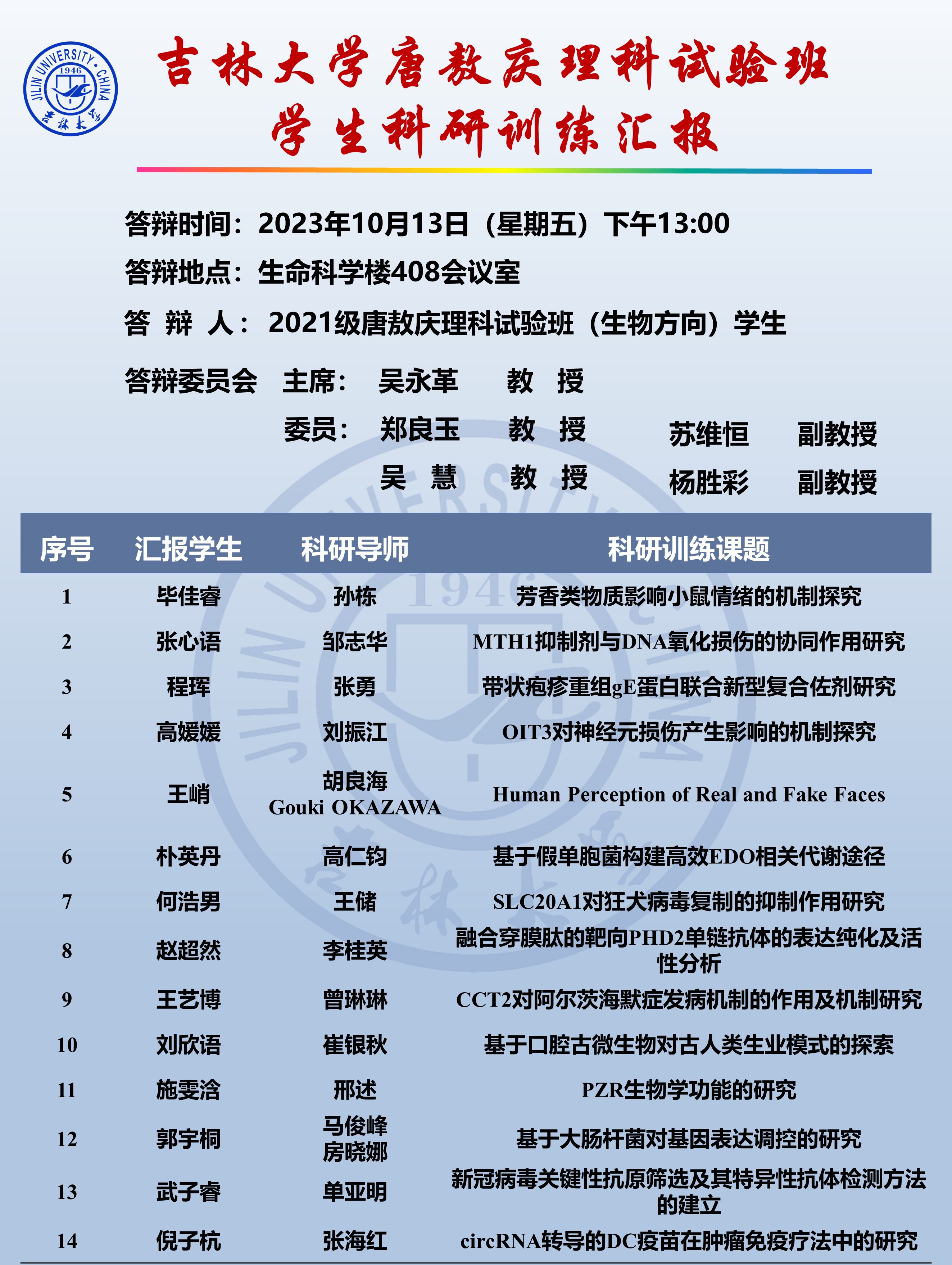 为提升唐敖庆理科试验班员工的科研素养,增强员工及科研导师之间的深入交流,太阳成集团tyc234cc于10月13日下午组织开展了唐敖庆理科试验班生物方向(唐生班)拔尖员工科研训练进展汇报。此次汇报面向全校公开进行,汇报主体为2021级唐生班全体员工和2020级唐生班员工代表,邀请吴永革教授、郑良玉教授、吴慧教授、苏维恒副教授、杨胜彩副教授担任专家评委。太阳成集团tyc234cc经理于湘晖教授、2021级唐生班科研导师、2022级唐生班员工以及公司唐生班学业导师团队出席汇报会,汇报会由副经理陈妍教授主持。