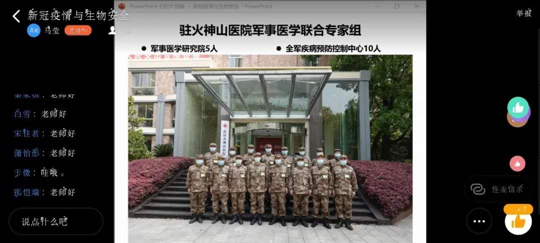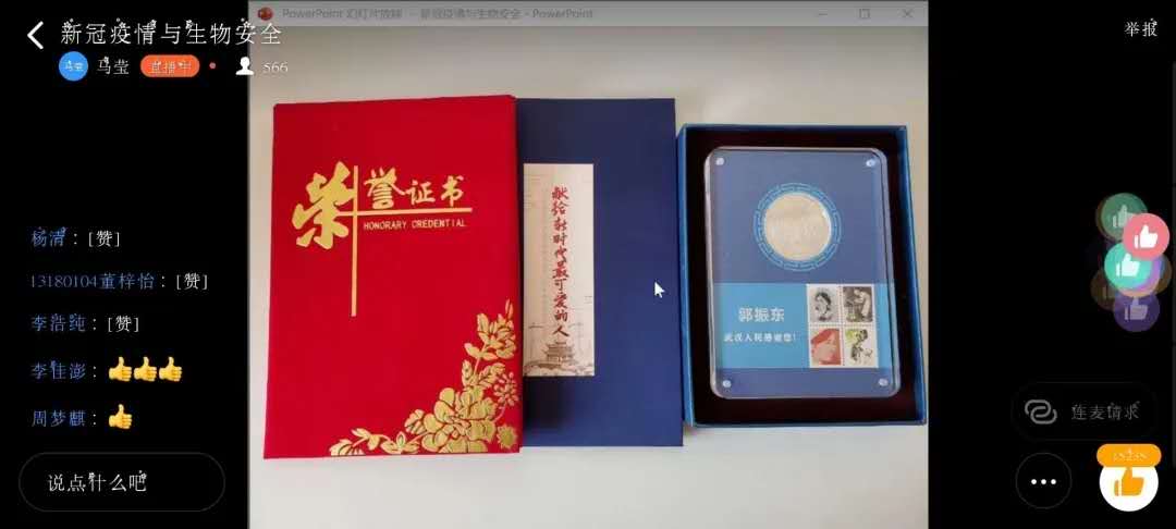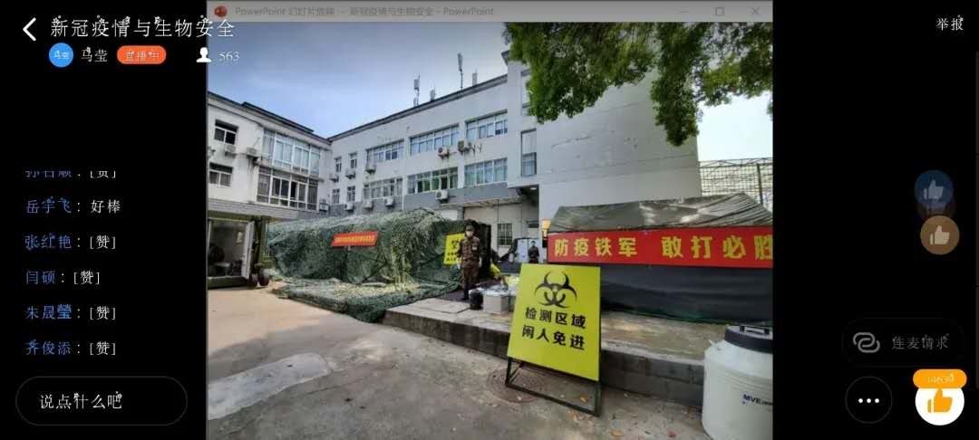 紧接着,郭振东老师讲述了他在武汉抗疫90天的故事。郭振东老师在武汉疫区主要负责移动实验室的检测。会议上,郭老师向同学们展示了疫情期间武汉的真实面貌。2月份的武汉,正是处于水深火热的时候,整个武汉城仿佛被按下了暂停键。面对多方面的压力,郭老师和他的同事们没有放弃。防疫指导,酒店风险评估,临床样品采集培训,建设火神山医院……同学们深刻地了解到疫情期间,武汉的医务人员的辛苦。同学们在评论区由衷地感慨,医务人员真的很不容易。在看到郭老师的“战役先锋”荣誉时,同学们在评论区中纷纷点了赞。