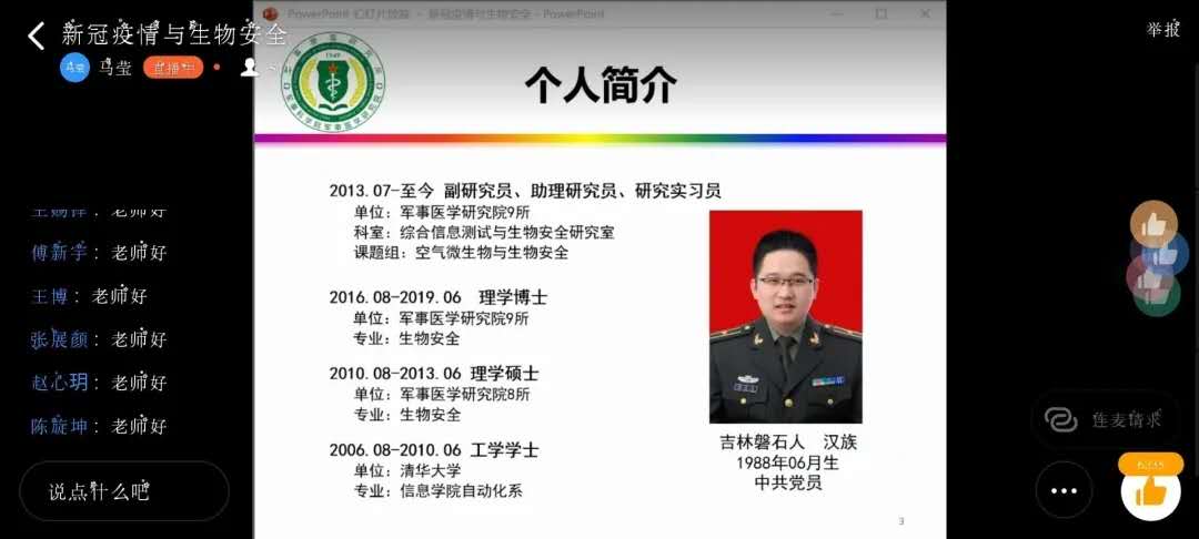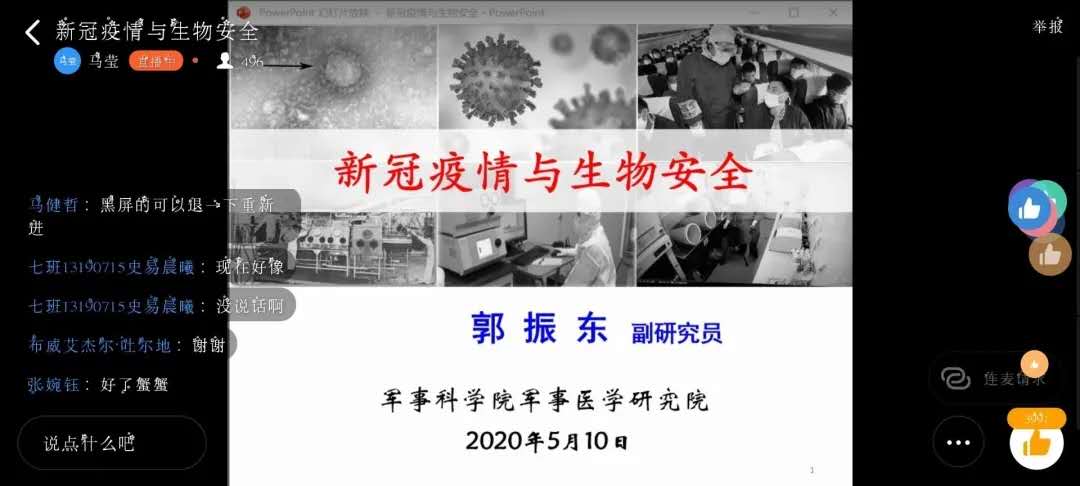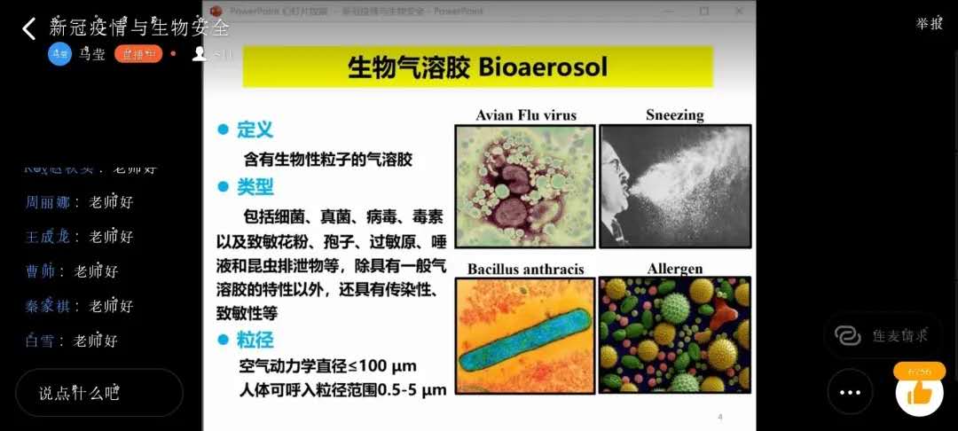 本次会议邀请了军事科公司军事医学研究院副研究员郭振东老师为大家讲述在武汉抗疫期间的故事和有关生物安全的情况。首先,郭振东老师介绍了生物气溶胶的相关情况。经气溶胶传播病原微生物往往更容易造成大范围流行。同学们了解到,包括新冠肺炎在内的许多大型疫情,都与生物气溶胶有关。通过对气溶胶的了解,同学们对于新冠肺炎有了专业的认识。