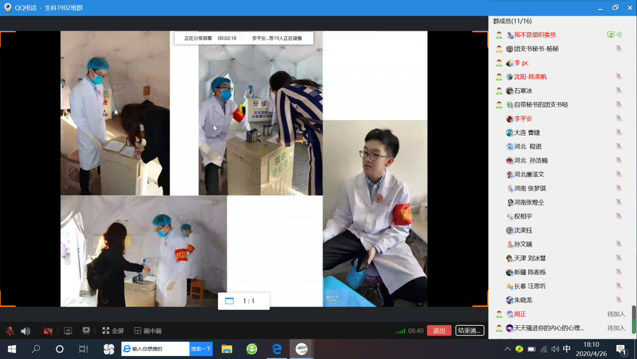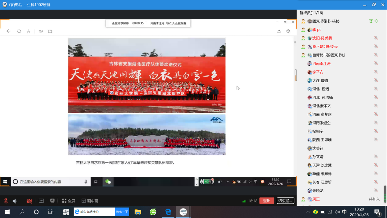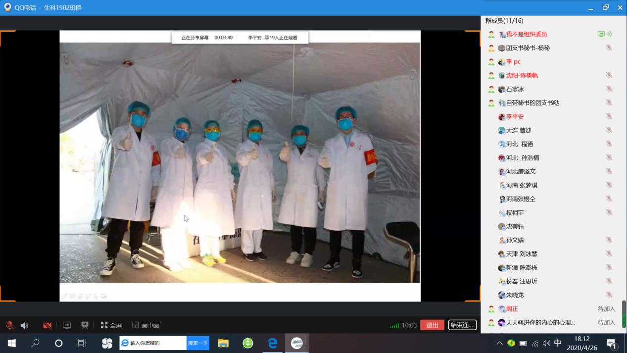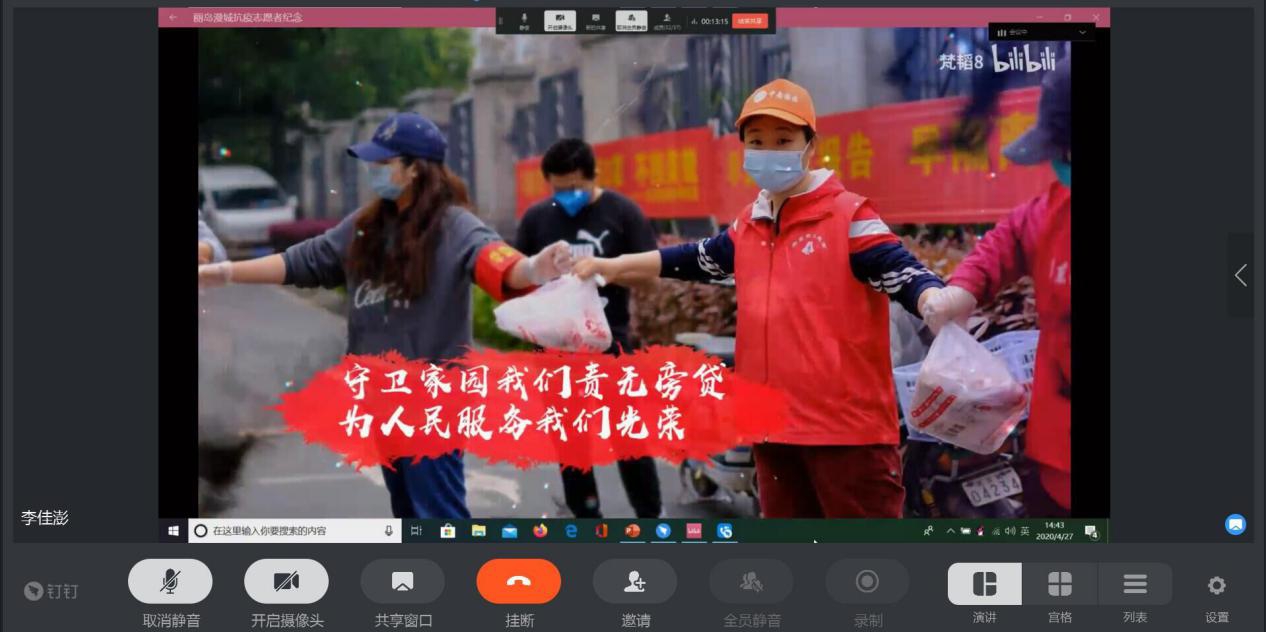准备工作:本次活动以参加抗疫活动的志愿者同学分享心得体会为主要内容,班委会邀请了3位同学进行分享。班委讨论后决定以团支书进行投屏,同学们召开音频会议的方式的方式进行本次活动。