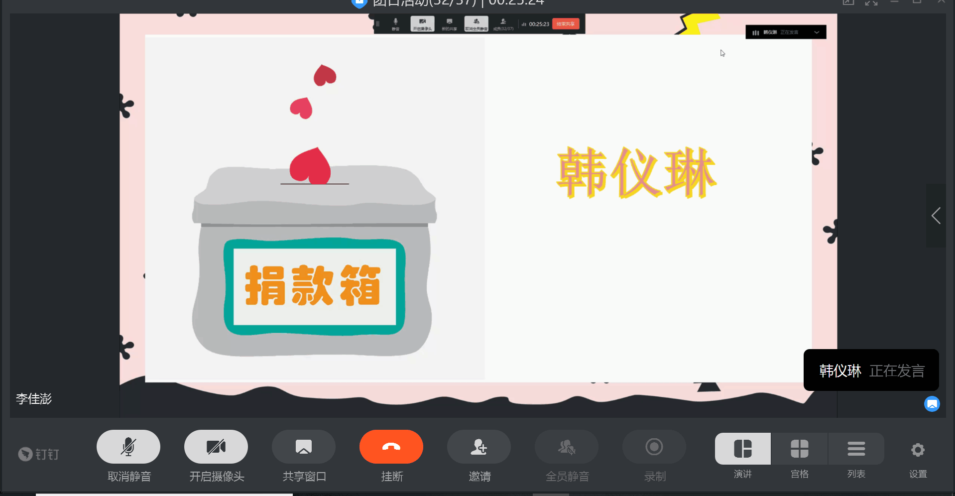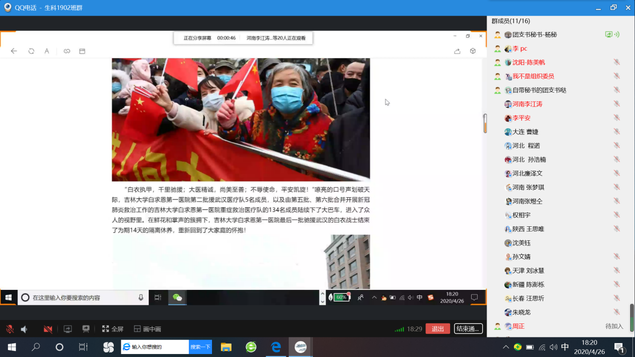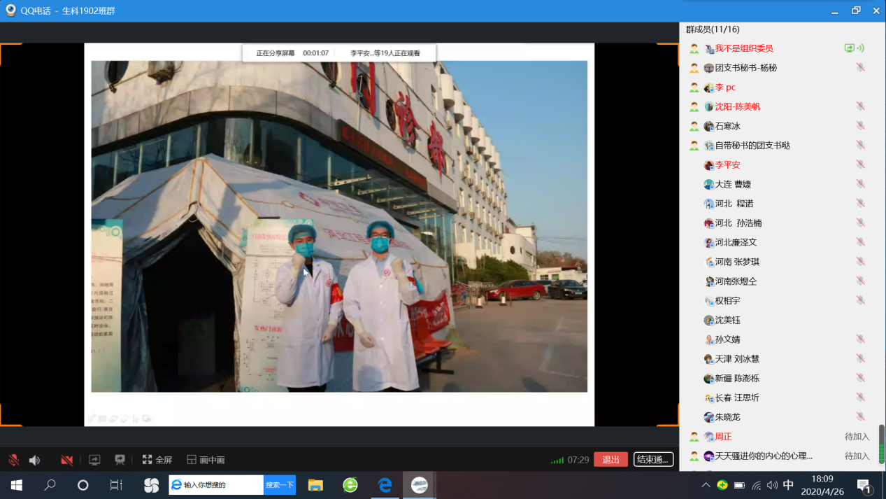 准备工作:本次活动以参加抗疫活动的志愿者同学分享心得体会为主要内容,班委会邀请了3位同学进行分享。班委讨论后决定以团支书进行投屏,同学们召开音频会议的方式的方式进行本次活动。