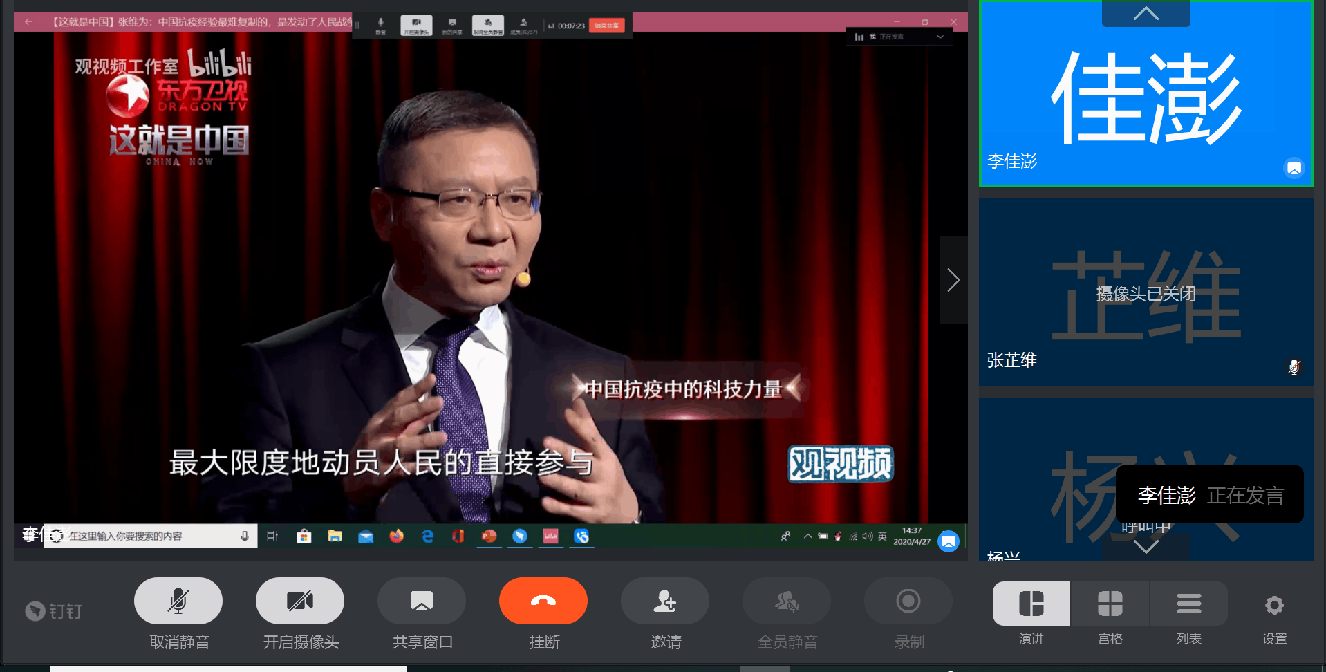 会议开始团支书首先带领同学们简单回顾了前几次线上班级活动并介绍了本次活动流程。随后进入本次活动第一项,支书首先为我们播放了张维为教授在《这就是中国》中的精彩演讲片段。张维为教授的演讲逻辑清晰,语言平实,为我们讲解了中国抗疫中的科技力量。有目共睹,在这次战“疫”过程中,我国的各种硬核科技得到广泛应用,背后是新中国科技事业的跨越式发展。而后团支书向大家汇报了中国的抗疫战绩,支书表示我们之所以能在疫情防控站中取得如此成就,要感谢党中央的战略定力,国家强大的综合实力,百姓的拳拳爱国心,这场惊心动魄的制度自信公开课,规模之大,感触之深,对每个中国人都是终生难忘的并呼吁大家坚定我们的制度自信。