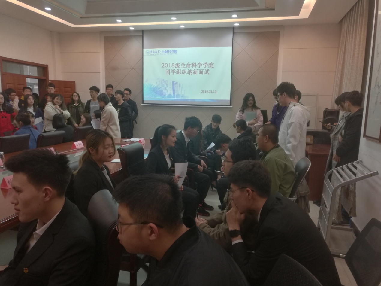 本次纳新面试工作于2019年3月10日17:00在生命科学楼335、107室举行。会前,各个部门成员提前布置好纳新的场所,确保纳新活动有序进行。前来参加纳新的同学有序地向有意愿加入的部门询问相关信息,各部门的部长副部也对新成员进行了严格面试,认真做好面试记录,并向他们明确了加入员工的工作组织所肩负的责任。期间,主席团成员穿梭于各个部门之间,监督纳新的公正公平性,维持纳新活动的正常秩序。