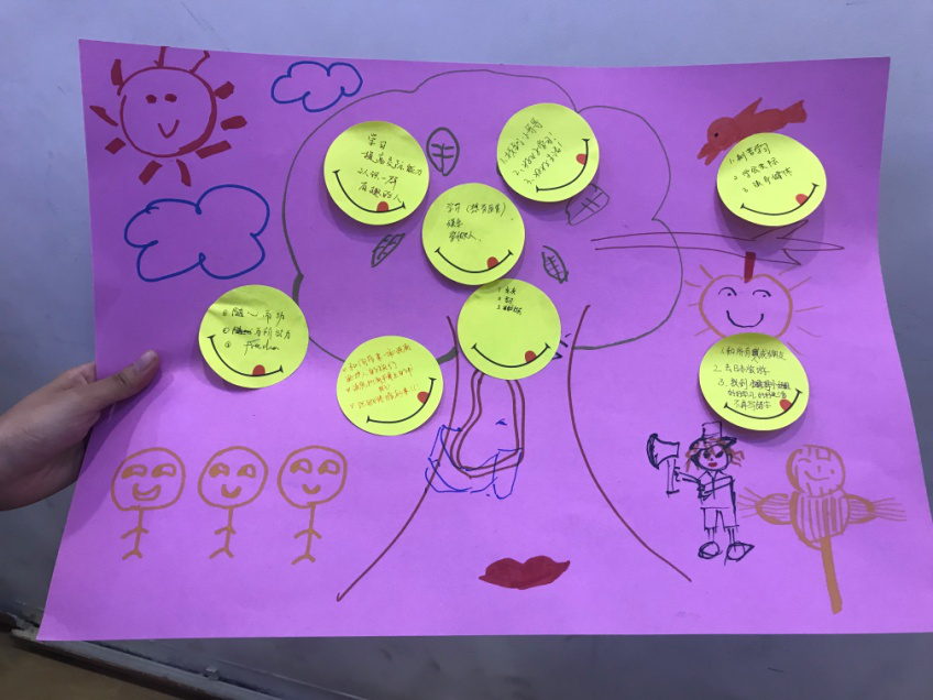 心理班会期间,同学们首先进行热身活动,放松心情,融入氛围。随后进行了四个游戏,“信任之旅”让每个人对同伴都建立了信任关系;“集体登陆”让大家紧紧抱在一起,成为集体的一份子,同时感受到了集体力量的强大;“人体字母”大家纷纷创意出单词:HAPPY、HOME等,增强了活动的乐趣;“人椅破冰”让同学们从快乐中体会到了集体的力量。在“快乐传递、信心启迪”活动中,同学们看着手中拿到的新同学对自己的印象,有的信心满满,有的偷偷笑着,还有的充满了斗志……最后每组同学都画了一幅《团体树》,形态各异却又不失风采,并在贴纸上写上了自己大学的目标。