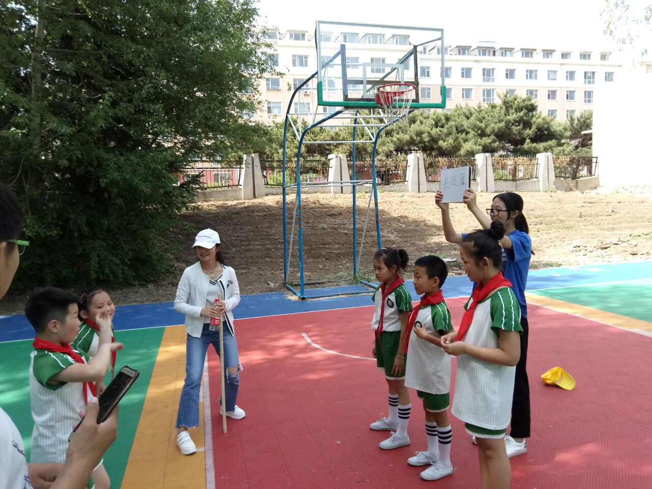 素质拓展活动中,在志愿者们的带领下,孩子们在篮球场上分组依次进行了你比我猜、五人六足、齐眉棍和乒乓转移四个有趣的团体游戏。快乐的时光总是过得飞快,转眼活动已进入尾声,在团体合照之后,孩子们也踏上了归程。在回去的路上,孩子们意犹未尽,志愿者们也依依不舍。
