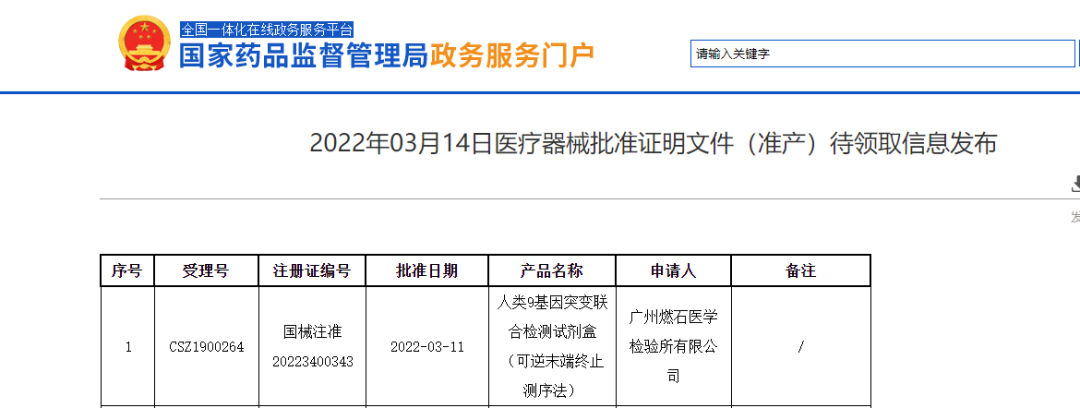 2022年3月14日燃石医学(纳斯达克股票代码:BNR)宣布,国家药品监督管理局(以下简称NMPA)正式批准了公司“人类9基因突变联合检测试剂盒(可逆末端终止测序法)”(商品名“燃石朗克™CDx”)的三类医疗器械产品的注册。该试剂盒是燃石医学获批的第二个基于高通量测序技术(Next Generation Sequencing,以下简称“NGS”)并符合伴随诊断标准的多基因肿瘤突变联合检测试剂盒,可用于体外检测非小细胞肺癌患者EGFR、MET、ERBB2、KRAS、BRAF、PIK3CA、ALK、ROS1和RET基因的多种变异状态,包括点突变、插入缺失、融合(重排)和扩增,全面指导非小细胞肺癌靶向药物治疗方案。