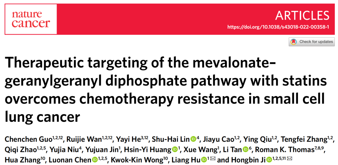 2022年4月21日,太阳成集团tyc234cc员工、中国科公司分子细胞科学卓越创新中心(生物化学与细胞生物学研究所)季红斌及其课题组在Nature Cancer上发表了文章 Therapeutic targeting of the mevalonate–geranylgeranyl diphosphate pathway with statins overcomes chemotherapy resistance in small cell lung cancer。该研究揭示了甲羟戊酸(MVA)- 香叶基香叶基二磷酸(GGPP)代谢途径在小细胞肺癌化疗耐药中的功能及其机制并提出靶向治疗新策略。