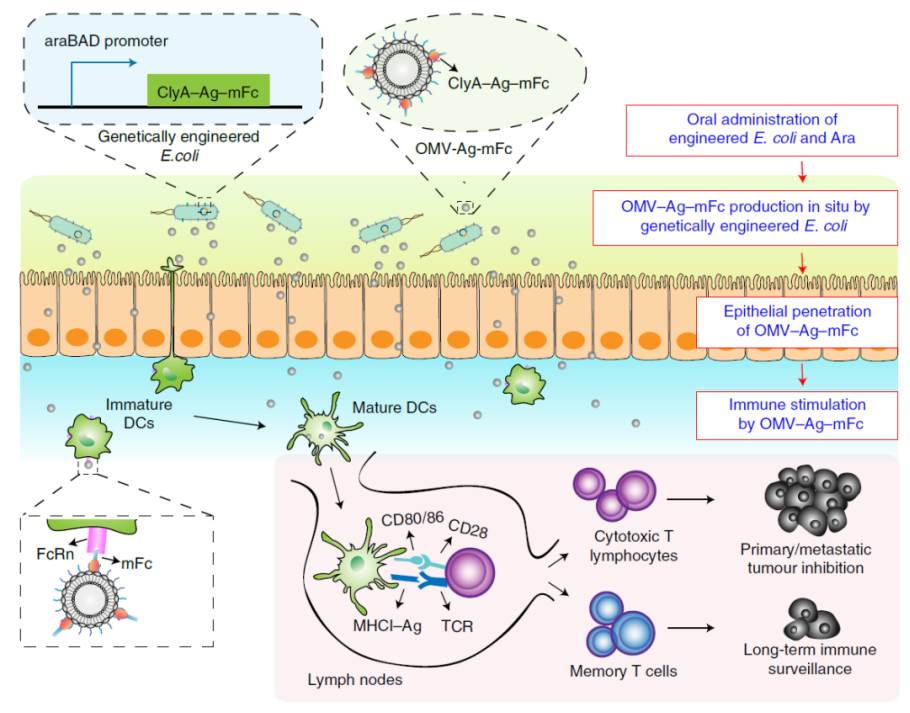 口服上述基因工程细菌和诱导剂阿拉伯糖后,就能实现在肠道中原位可控地产生携带肿瘤抗原的外膜囊泡——OMV-Ag-mFc。