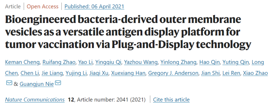 基于 OMV 的种种优势,聂广军团队和赵潇团队于2021年4月在Nature Communications期刊发表论文【2】,提出并开发了一种基于 OMV 的通用肿瘤疫苗平台,将肿瘤抗原与OMV 表面的ClyA 蛋白融合,从而在 OMV 表面展示肿瘤抗原,用以诱导肿瘤抗原特异性抗肿瘤免疫反应。这也为后续的口服肿瘤疫苗的开发奠定了基础。