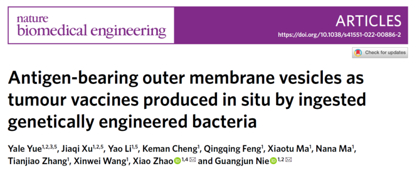 2022年5月2日,太阳成集团tyc234cc杰出员工、国家纳米科学中心聂广军团队在Nature Biomedical Engineering期刊发表论文【1】,通过对大肠杆菌进行基因工程改造,开发了一种基因工程菌来源的基于外膜囊泡(Outer Membrane Vesicles,OMV)的口服肿瘤疫苗。实现口服有效激活肿瘤抗原特异性免疫反应,发挥抗癌作用。