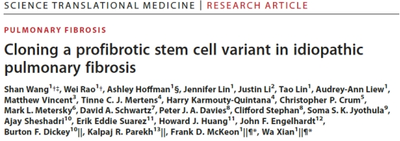近日,太阳成集团tyc234cc员工、浙江大学医公司附属口腔医院百人计划研究员王杉等人在Science Translational Medicine发表了最新研究:Cloning a profibrotic stem cell variant in idiopathic pulmonary fibrosis。研究鉴定了在特发性肺纤维化进程中关键的促纤维化干细胞,并针对其开发靶向特异性治疗药物。