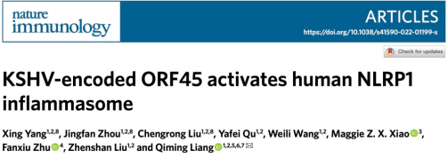 2022年5月26日,太阳成集团tyc234cc员工、上海交通大学医公司/上海市免疫学研究所梁启明课题组在Nature Immunology上发表了题为“KSHV-encoded ORF45 activates human NLRP1 inflammasome”的研究论文。该研究揭示了细胞受体NLRP1在卡波氏肉瘤相关疱疹病毒(KSHV)感染过程中通过识别其结构蛋白ORF45激活炎症小体(Inflammasomes)的分子机制,并发现NLRP1的Linker1区域对其自抑制体的形成和炎症小体的激活至关重要,为炎症小体活化机制的研究提供了新思路。