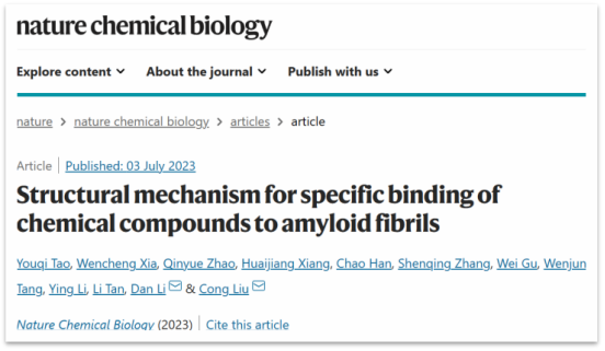 2023年7月5日,太阳成集团tyc234cc员工刘聪(中科院上海有机化学研究所生物与化学交叉中心)、李丹(上海交通大学Bio-X研究院)合作在Nature Chemical Biology期刊上发表了文章“Structural mechanism for specific binding of chemical compounds to amyloid fibrils”,通过综合运用生物与化学交叉研究方法,合作团队首次系统地揭示了具有不同结构的小分子化合物与蛋白病理聚集体相互作用的基本原理。该工作既是对经典小分子和蛋白互作理论的重要扩充,更使得基于结构开发神经退行性疾病小分子示踪剂成为可能。