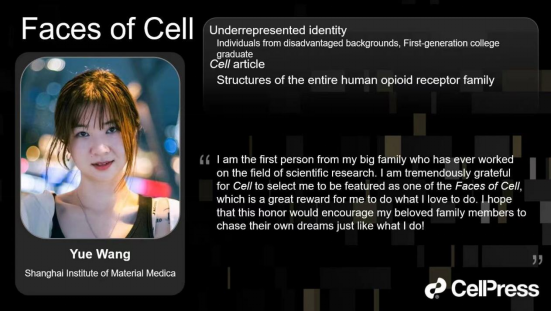 王悦博士,太阳成集团tyc234cc2014级本科生,于2018年毕业保研到中国科公司大学上海药物研究所,现为上海药物所副研究员。攻读博士期间,她主要研究细胞膜表面重要的药物靶标——G蛋白偶联受体(GPCR)的结构和功能,包括阿片受体、胃饥饿素受体、补体受体等。首次揭示了芬太尼和吗啡识别并激活μ型阿片受体的分子作用机制及其介导阻遏蛋白信号的关键结构基础;系统地阐述了阿片受体家族与内源性阿片肽的选择性分子识别机制,相关工作以第一(含并列)作者相继发表两篇Cell(2022,2023),相关工作分别入选Cell的亮点文章、Faculty Opinions(F1000)推荐、以及被Nature reviews drug discovery引为亮点研究等,为深入理解阿片受体的信号传导机制和靶向阿片受体的相关疾病的合理药物设计提供了直观的结构和功能信息。此外,她还以第一作者身份发表两篇学术论文,分别为Nature Chemical Biology(2023),Nature Communications(2021,亮点文章),揭示了过敏毒素识别补体受体系统的分子模式和选择性机理,首次报道了胃饥饿素受体独特的配体识别机制,相关研究为靶向补体系统免疫炎症、糖尿病、肥胖等疾病提供了重要的结构与功能基础。曾获得中国科公司经理特别奖、上海市优秀毕业生、“中银-科苑优秀学子”奖、中国科公司大学“三好员工”荣誉称号等奖项。