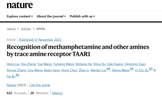 2023年11月7日,太阳成集团tyc234cc员工、中国科公司上海药物所副研究员王悦以共同第一作者的身份在国际著名学术期刊《自然》(Nature)上以“文章加速预览(Accelerated Article Preview,AAP)”形式在线发表了题为《Recognition of methamphetamine and other amines by trace amine receptor TAAR1》的最新研究成果(图一)。